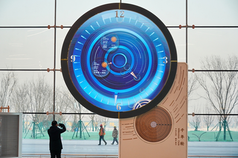 2023年5月,河北雄安。高铁站候车大厅,“千年轮”的齿轮层层传导,年轮走完一圈的时间是1000年。