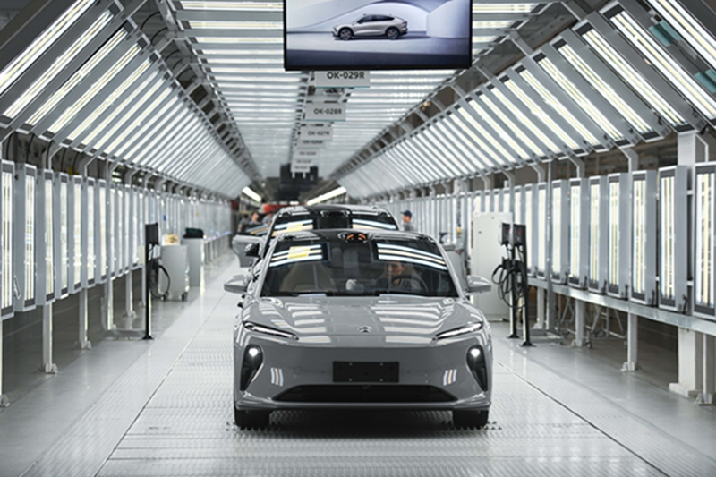 这是安徽省合肥市新桥智能电动汽车产业园蔚来第二工厂内的新能源汽车生产线日摄)。新华社记者 张端 摄