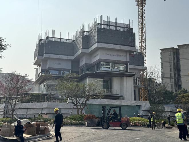 近日,观点新媒体路过广州白云润云路一处工地,看到一栋在建的叠式建筑仍被脚手架和防护网包裹着,但底层已撕开“包装”的落地玻璃窗,透出的暖黄灯光却像是提前亮起的家灯,在夜色里显得格外温馨。